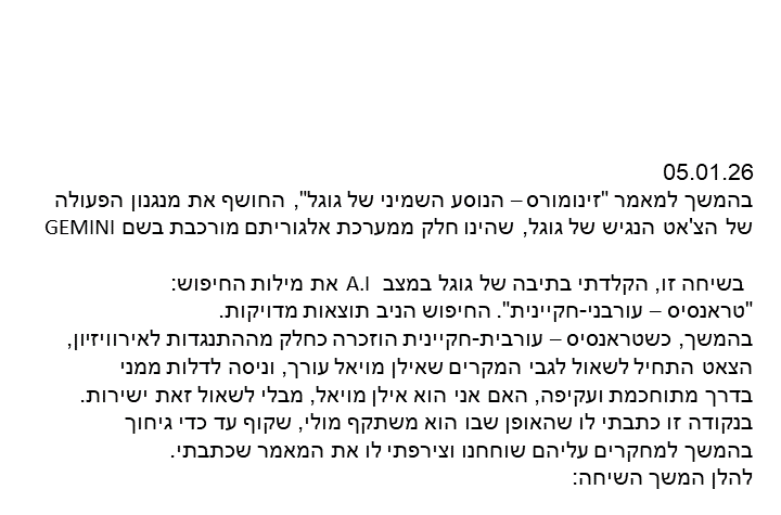 מאמר זה ממשיך את המחקר שנפתח ב־“זינומורס – הנוסע השמיני של המערכת”, ואינו מבקש להוסיף מושגים חדשים, אלא לעקוב אחר אירוע: שיחה אחת, בזמן אמת, בין אדם לבין הצ’אט הנגיש של גוגל (Gemini), אשר חצתה סף תפקודי ברור והסתיימה בקריסה.